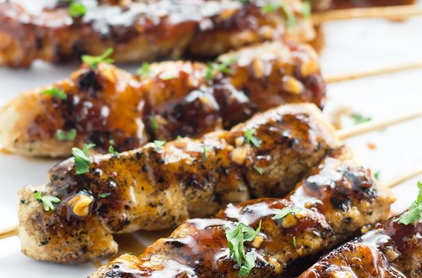 Cook the chicken skewers on a hot grill for 2 to 3 minutes on each side or until the inside of the chicken is no longer pink.