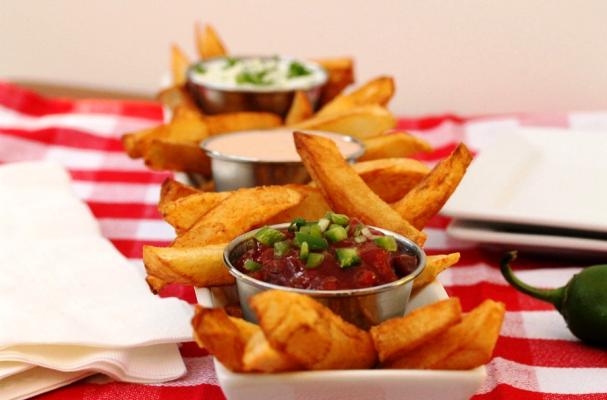 Homemade french fries served with easy-to-make dipping sauces. The dipping sauces are delish: Hot Pepper Ketchup, Chipotle Sauce, and Baked Potato Topping Sauce.