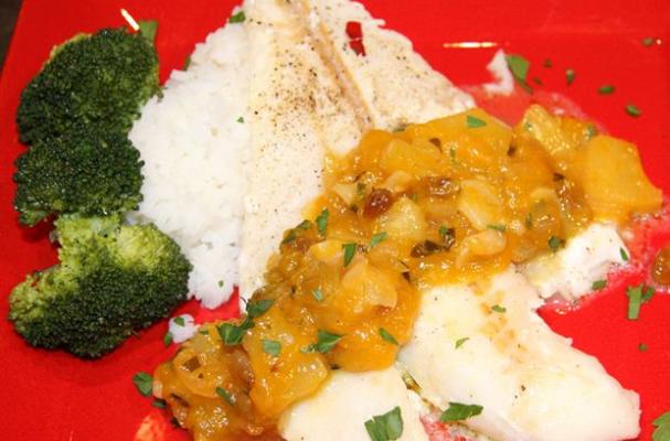 Lime Baked Fish with Crispy Garlic and Mangoes Sauce