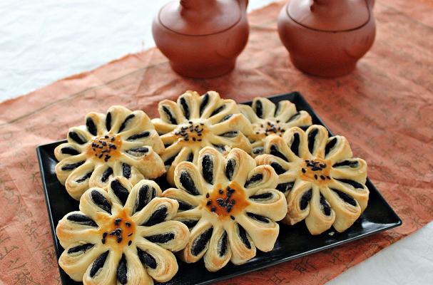 Chrysanthemum Crisp 菊花酥 (ju hua su) last week. It has a flaky crispy outer crust filled with layers of black sesame tau sar (red bean) paste filling.