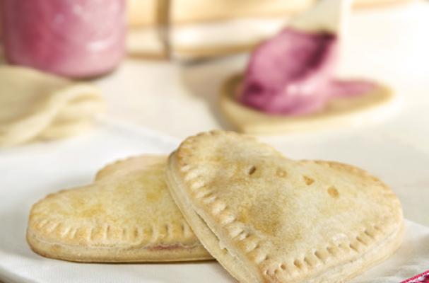Place half of the pie hearts onto the prepared cookie sheet and add one teaspoon of pie filling to the centre of each one.