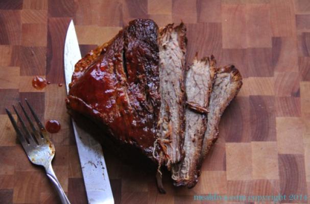 Trim any large, thick pieces of fat from the brisket (don’t remove all of the fat because it keeps the meat moist during cooking and adds flavor)