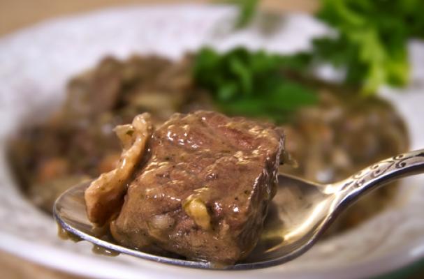 After one hour add pearl onions, mushrooms and bacon to the pot. Continue to simmer until beef is tender, about an additional 30 minutes.