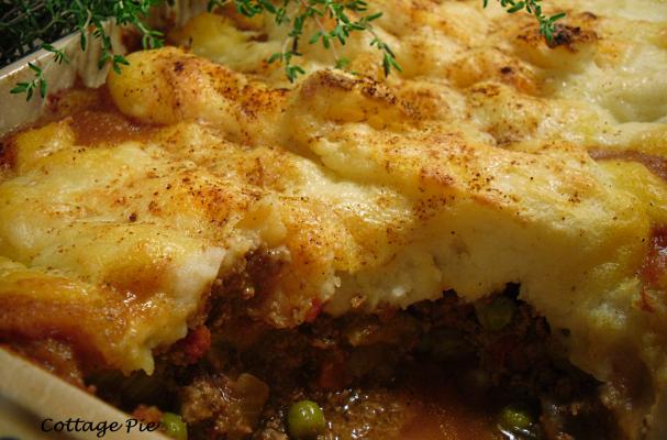 Arrange potatoes on top of filling. Top with Cheddar cheese and 2 Tbsp. butter and bake until potatoes and meat are heated through and potatoes begin to brown.