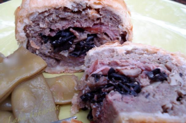Place the wrapped meatloaf on a foil-lined baking sheet and bake in an oven at 200˚C for half an hour, covered with foil. Uncover and bake for additional half hour or until pastry is golden brown.