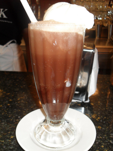 1. In tall glass, pour milk. Top with syrup and a scoop of ice cream. Fill with soda water. Garnish with chocolate curls.