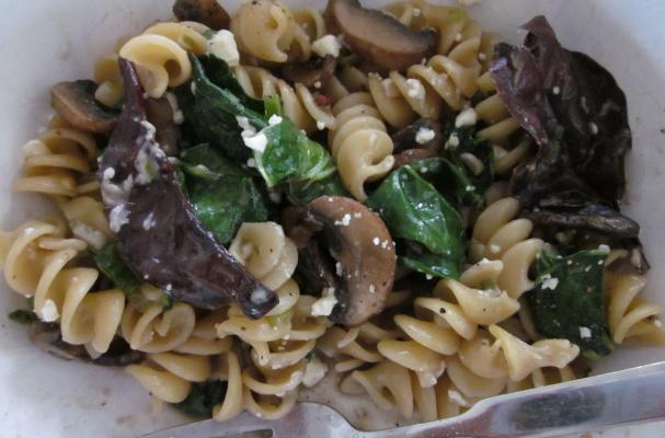 Add mushrooms back into the pan with garlic. Add your al dente pasta to the pan to finish cooking with the mushroom sauce. Add half of the Feta cheese. Cook over medium heat until pasta is cooked through.