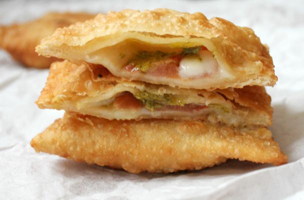 A traditional Brazilian snack with a caprese style filling. Light pastry, fried with mozzarella, pesto and tomato.