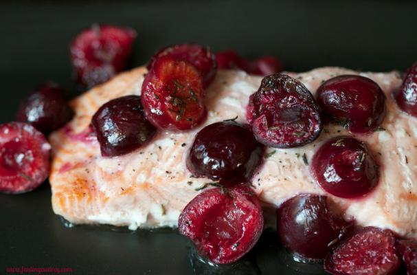 In a large bowl, toss together cherries, lemon juice, honey and thyme. Arrange salmon skin-side down on a large parchment or foil-lined baking sheet, sprinkle with a pinch of sea salt and black pepper. Scatter cherry mixture over and around salmon and bake 12-15 minutes. Switch oven to broil and cook an additional 3 minutes until salmon is just cooked through and cherries are juicy and caramelized, (you want the thickest part of the fish to reach an internal temperature of 131 degrees F on an instant-read thermometer). Remove the salmon from the oven and allow to rest, uncovered, for 5 minutes.