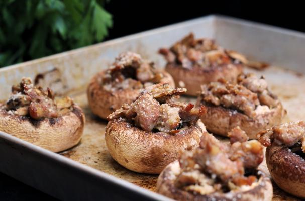 Clean mushrooms and remove stems, chop stems and sautee in a pan with oil and garlic.