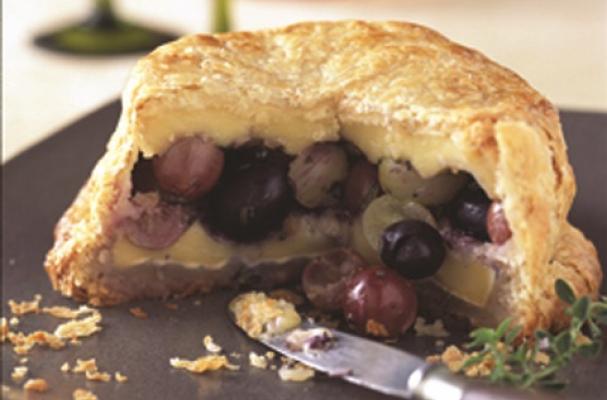 Brie baked in puff pastry (Brie en croute) is a cocktail party classic. The cheese comes out warm, easily spreadable and delicious. To make this appetizer even more festive, stuff it with fresh grapes – in season from California through January. The result is simply luscious, not overly sweet, the grapes still juicy, savoury with fresh herbs and colourful to boot. If you can, substitute French brie with a brie-like cheese from a local producer. Either way, the dish is easy to prepare and the results dependable and gratifying.