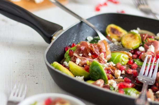 This roasted Brussels sprouts salad with prosciutto, pomegranate and Feta cheese makes a great side dish on your Holiday table!