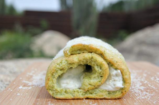 Using the parchment paper at the bottom from the smaller edge, roll the roulade up.