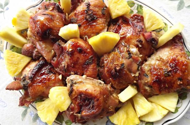 Remove the chicken from the marinade and place in a baking pan. Bake for 50 – 55 minutes or until the juices run clear and the skin is a nice golden color. Plate the chicken and serve with fresh pineapple.