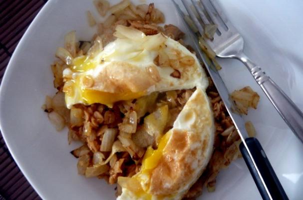 Scoop oats into a bowl and top with diced onions and fried egg.