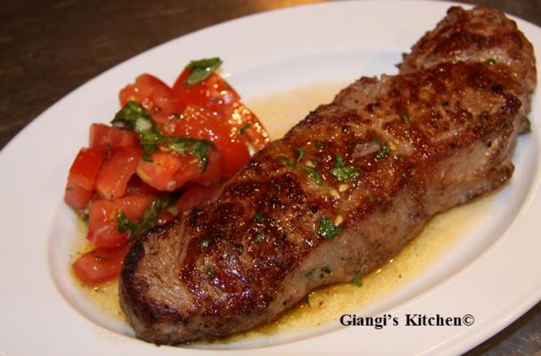 Place the steak on a plate and serve with the tomatoes salad on the side and pour the juice over the steak