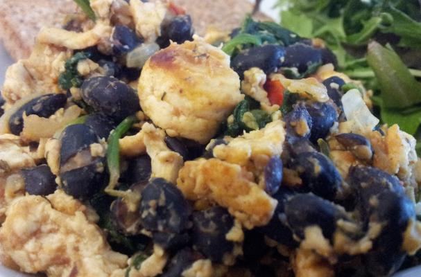 Once the spinach has wilted into the mix, you’re vegan tofu scramble is done! Serve with fresh greens of your choice on the side (we love arugula) and a piece of toast. No one will ever guess there’s hardly any fat in it!