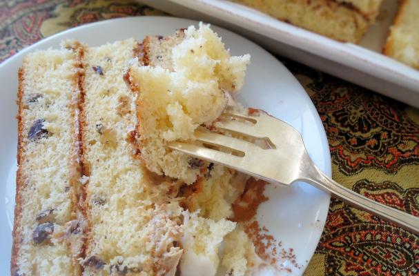 Everybody seemed to love the recipe for melted ice cream cupcakes, probably because they're so easy to make and require only a few ingredients. This variation makes a light and delicate layer cake. It is filled with luscious espresso flavored butter cream and dusted with cocoa powder. I added finely chopped dark chocolate to the batter, which reminds me of Italian Stracciatella ice cream. The chocolate pieces create a nice balance and add a little bite to the smooth and soft texture of the cake.