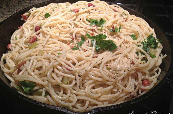 Mix the lemon juice with a tablespoon or two of olive oil, extra red pepper flakes and toss into the spaghetti along with the other half of the parsley and grated cheese.