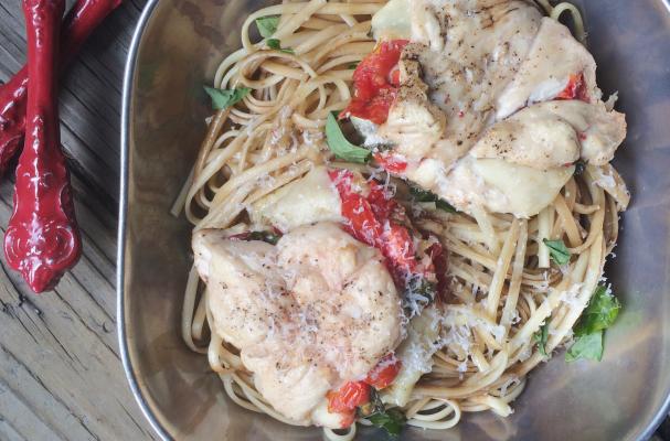 Cook chicken for 20 minutes in a 9x13-inch baking dish, or on a baking sheet lined with foil. After 20 minutes, remove the chicken from the oven and if is not fully cooked, place back in the oven for an additional 3-5 minutes.