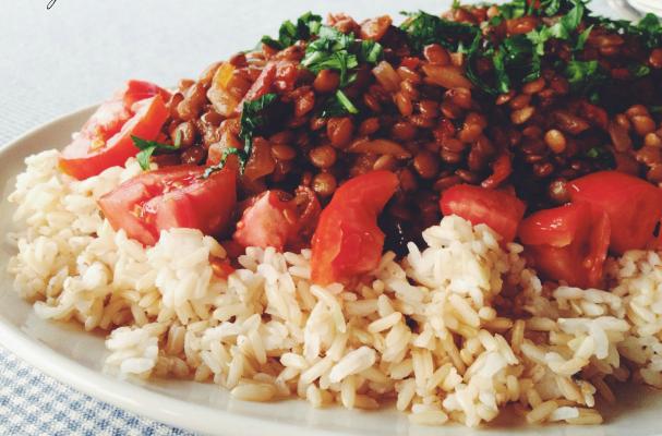 Plate the lentils with the rice. Garnish with the tomatoes, chopped parsley and a drizzle of olive oil.