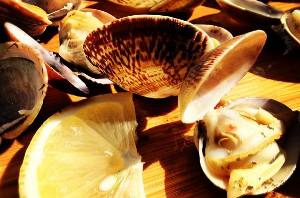 I found some beautiful clams at the market today. They caught my notice because a cheeky one spit at me as I walked by. The shells have dazzling designs and are full of meat inside. I was going to make something a little more complicated, but my class ran way over and the steamy night called for a chilled glass of wine and simplicity. It is also great idea for an easy summer appetizer.