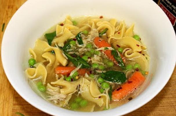 Add chicken back to soup. Pour in both boxes of chicken broth and a cup to a cup and a half of the wine.