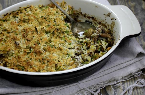 8. When sauce is thickened and all ingredients cooked, remove stew from the oven and sprinkle over the crust mixture.