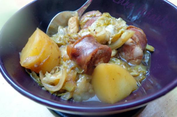 Add the sausages, cabbage and potatoes and simmer, covered, stirring occasionally, for 20 minutes or until the vegetables are tender.