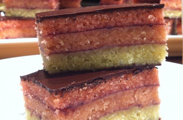 I made these rainbow cookies pretty in pink in honor of breast cancer awareness month, for my two dear friends who battled breast cancer. These rainbow are also beautiful in their traditional red and green for Christmas. These have soft almond flavor cookie/cake between layers of jam wrapped in a decadent dark chocolate coating. So moist and full of that delicious almond flavor, you would never guess these are gluten and dairy free! They also freeze well.