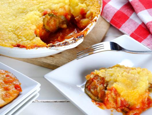 Slice all vegetables thinly (about a quarter of an inch), toss in olive oil, season with salt and pepper, add in dried oregano and arrange in a deep baking dish. Top with crushed tomatoes.