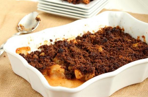 Transfer the apples to the baking dish and sprinkle the cookie mixture over top.