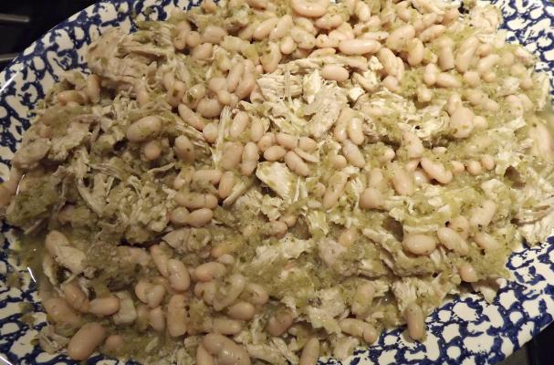 When chicken is cooked shred and add back to the sauce along with the drained beans.