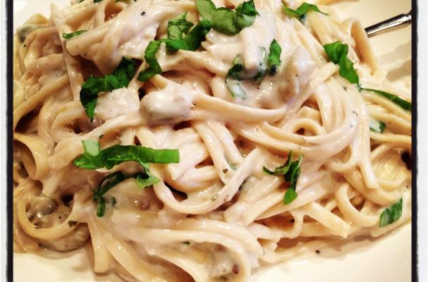 Came home and the fridge was running on empty so I headed to the pantry. Keeping it quick and simple I decided it was a pasta kind of night! I had some light cream in the fridge to use up and some marinated artichoke hearts. I also used a whole lot of fresh basil in this sauce which adds great flavor!