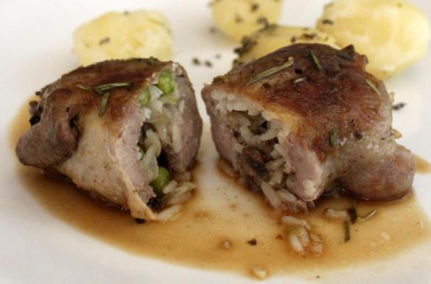 For stuffed quails, make a filling by heating butter in a pan and sautéing the onion till it’s translucent. Add garlic and mushrooms, season to taste and cook for a few more minutes. Mix the mushrooms with the rice and the peas. Debone the quail (you may leave bones in the wings), put a little bit of filling onto each bird, reshape it and sew it up. Put more filling inside to make it tightly stuffed. Tie up the legs and the wings. Heat olive oil in a pan and caramelize the birds on both sides. Add stock, cover with the lid and cook on low for about 20 minutes or until the quails are tender.