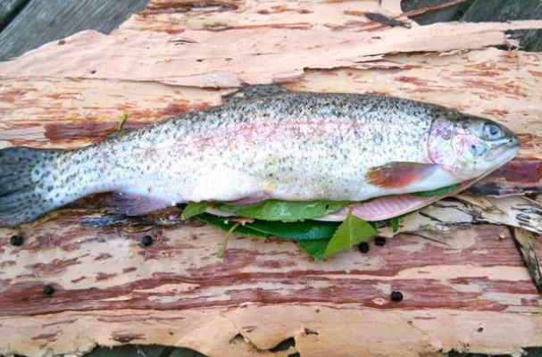 Stuff the fish with fresh lemon myrtle leaves, Tasmanian pepper berries and a couple of cloves of garlic.