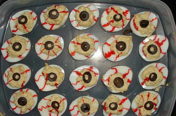 These deviled eggs are easily made into ghoulish bloodshot eyeballs with ketchup and black olives. Perfect for Halloween!