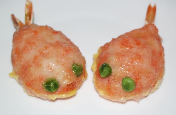 Slide the fishes gently onto a plate, and insert the prawn tails. Reshape if necessary.