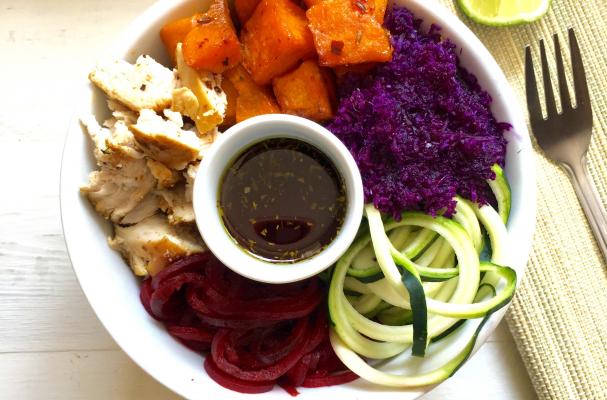 10 Minute Paleo Chicken, Sweet Potato & Zoodle Skinny Salad