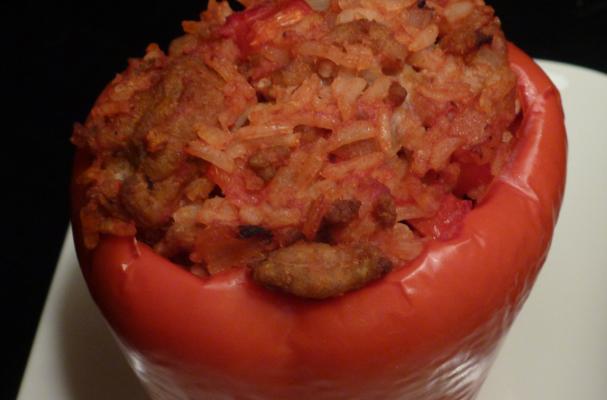 I love bell peppers. Usually I just cut them up and use them as part of a recipe, but this time I wanted to make them the focus of the meal, so I decided to try stuffing them. I looked around on the Food Network’s site and found this creation from Emeril was one of its top-rated recipes.