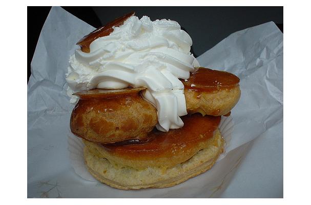 PUFFS: When water is boiling briskly add butter, let melt and bring to boiling. Add flour and stir hard. Cook over low heat until mixture is heavy and smooth and follows spoon around. Remove from heat. Cool. Add eggs one at a time. Beat each one in mixture before adding next. Batter should be stiff enough to hold shape. Drop by spoonfuls onto a greased baking sheet. Bake at 375 degrees for 50 minutes. Cool, cut top to make cover. Fill. Makes 8