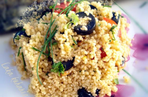 Run a fork through the couscous to break up the grains and add olive oil, black olives, tomatoes, toasted pine nuts and herbs. Combine.