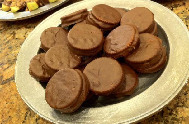 In a double boiler, melt the Nuggets on low heat, stirring often. Once the Nuggets are melted to a smooth consistency, add 2-3 (depending on our taste) drops of mint extract. Be very careful not to add too much of the extract or the chocolate will harden and you will have to add more Nuggets. Drop one of the round butter crackers into the melted Nuggets and using two forks, flip the cracker until completely coated with the melted Nuggets. Place the coated cracker on wax paper to harden. Repeat with remaining crackers. Keep in a sealed container or in the fringe. Makes 12 treats