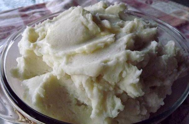 Drain and place in deep bowl while still hot. Add the butter, sour cream and milk and spices and mash.