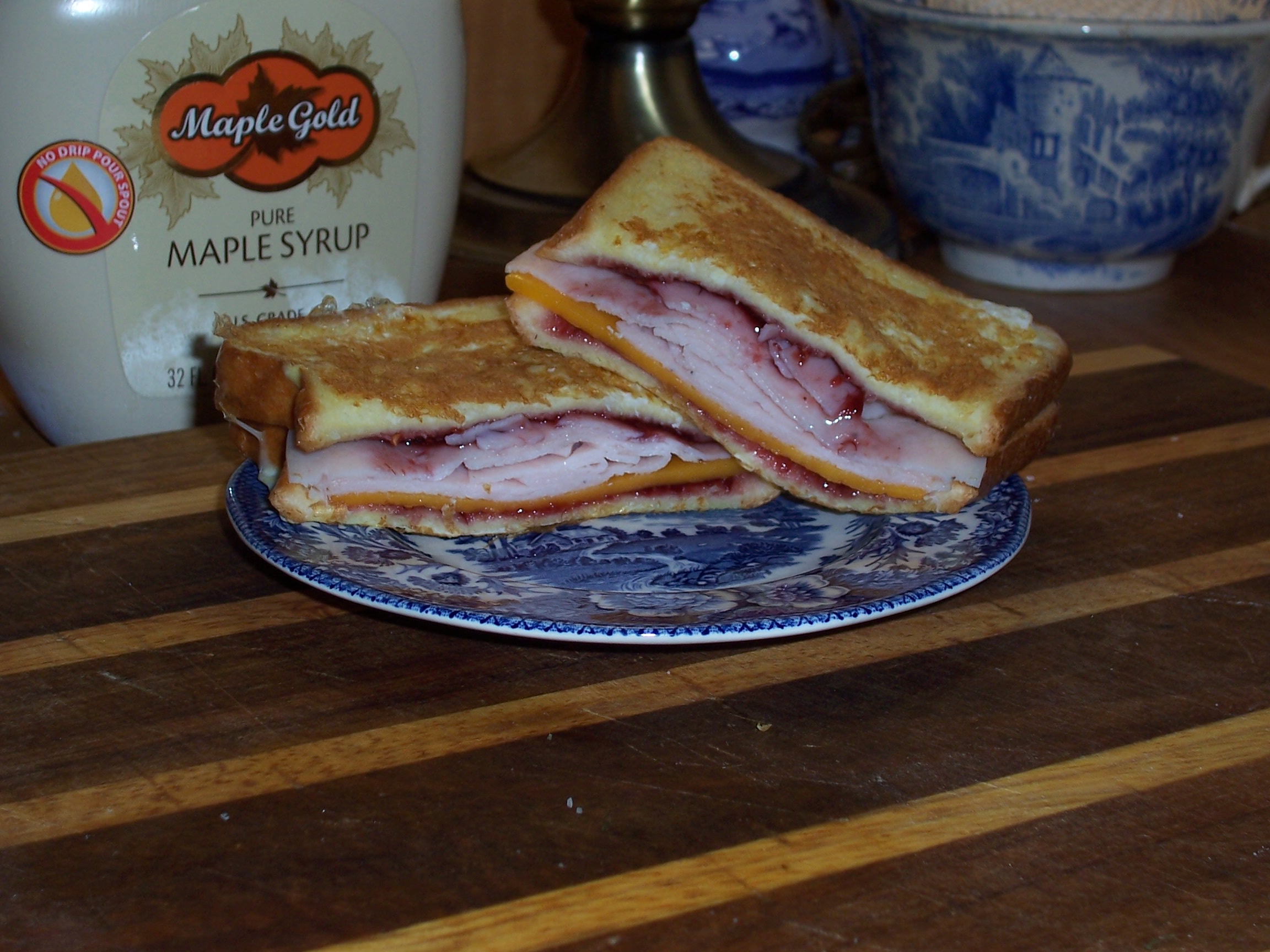 Like many food items the Marco Polo Sandwich is another of those not quite exact recipes that has been translated into various incarnations. Many years ago we began a brunch menu in a restaurant I was working at and we served one with three slices of bread with mayo, turkey and jack cheese a slice of bread then a thin slice of fresh pineapple, cut on a bias the two halves were dunked into a waffle batter and deep fried and served with red currant jelly. It was a big favorite. I have seen various other versions from very simple to quite involved. My version is a little easier to make and just as tasty.