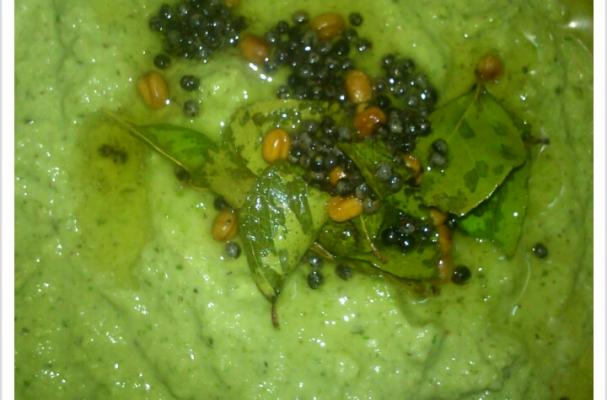 7. Pour the seasoning mixture to the grinded mint chutney mixture.