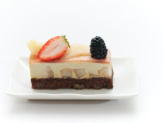 Remove the brownie & place it at the bottom of a 8" square mousse ring. Brush generous amount of oolong syrup on the brownie. Pour the oolong mousse over the brownie, arrange the pears evenly over the mousse, refrigerate to set. Pour the jelly on top & refrigerate to set. Carefully remove the cake from the mousse ring, cut into 10 entremets & decorate with fruits.