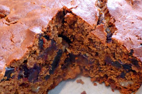 When the tea mixture has cooled and the butter melted through it, add it to the sugar and egg mix. Add the walnuts and the flour and stir through with a wooden or metal spoon until everything is evenly incorporated.