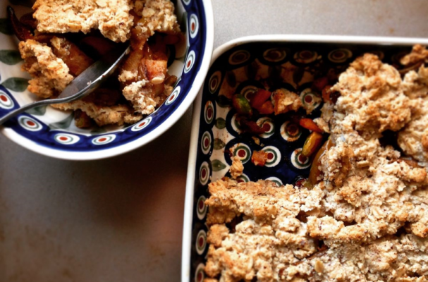 Fruit Crumble with pear and pistachio