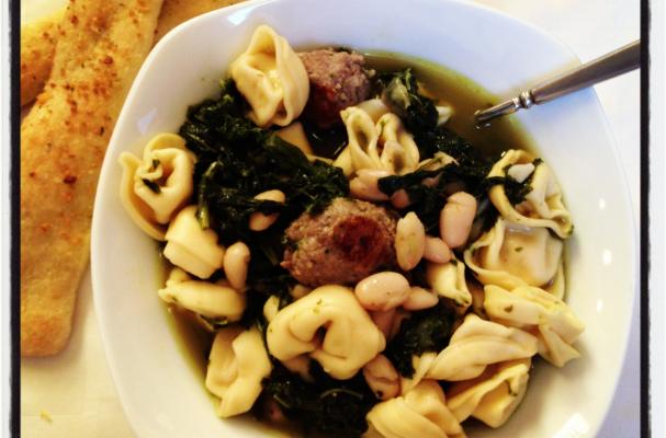 Tortellini with Kale, Cannellini Beans and Sausage in Broth